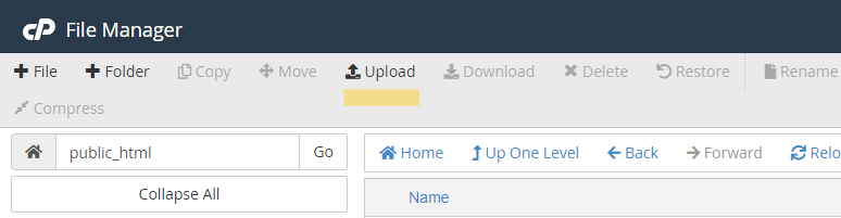 - Once you're in the "public_html" directory, you can either use the "Upload" button in the toolbar or right-click in the File Manager and select "Upload."